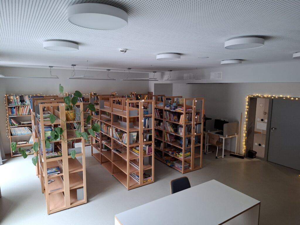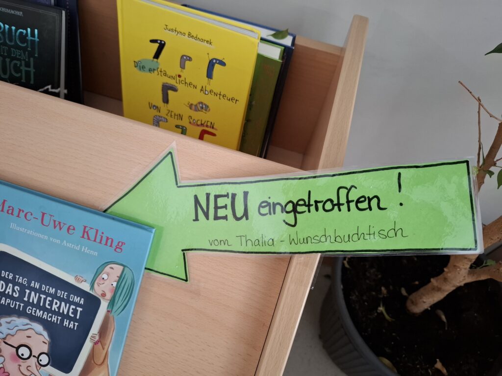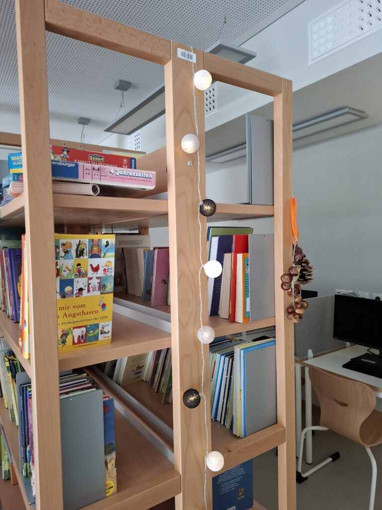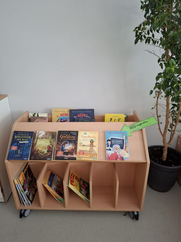 um unsere Bibliothek für Euch noch gemütlicher zu gestalten, haben wir neben weichen Sitzunterlagen für die Hochebene tolle Kissen gekauft, Lichterketten aufgehangen und mit kreativen Bildern gestaltet. Nach den Ferien folgen noch 2 große, bequeme Ohrensessel. Im neuen Bücherwagen findet ihr zukünftig immer alle aktuellen Bücher vom Thalia-Wunschtisch, die uns von Eltern nach unseren Wünschen gespendet werden.